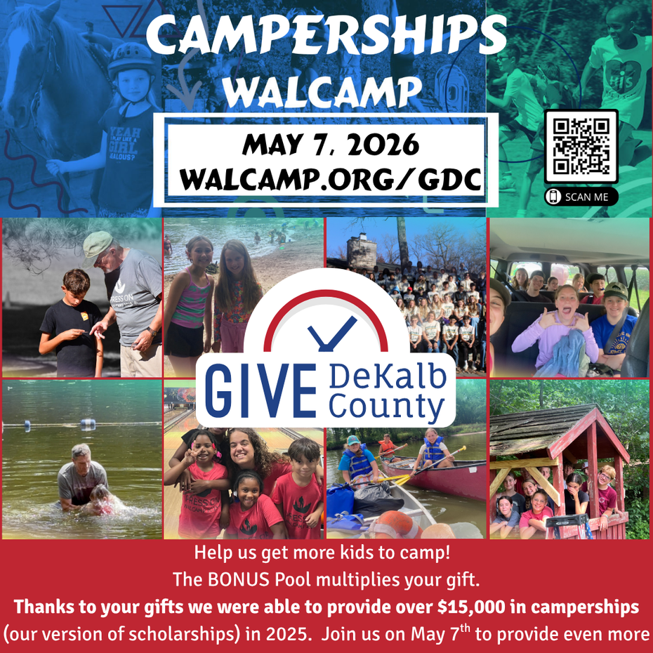 On May 7, 2026 Walcamp will again be participating in Give DeKalb County, an annual day of giving raising support and awareness of the Non-Profits that serve DeKalb County. We participate in this day of giving to provide camperships and subsidize our Summer Camp Ministry. All donations through Give DeKalb County to Walcamp go directly to Walcamp and are Multiplied by the sharing of a bonus pool. Last year we received over $1500 from the bonus pool alone.