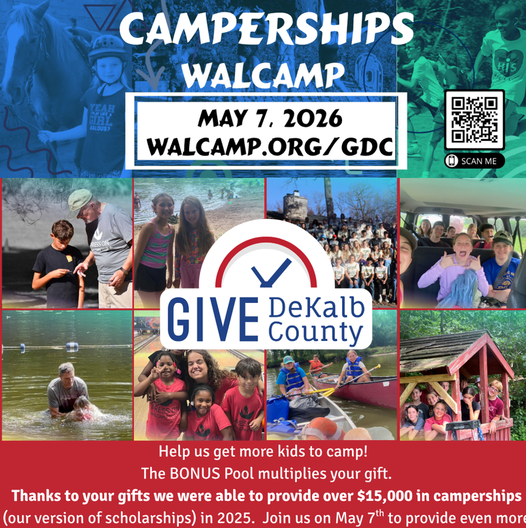 On May 7, 2026 Walcamp will again be participating in Give DeKalb County, an annual day of giving raising support and awareness of the Non-Profits that serve DeKalb County. We participate in this day of giving to provide camperships and subsidize our Summer Camp Ministry. All donations through Give DeKalb County to Walcamp go directly to Walcamp and are Multiplied by the sharing of a bonus pool. Last year we received over $1200 from the bonus pool.