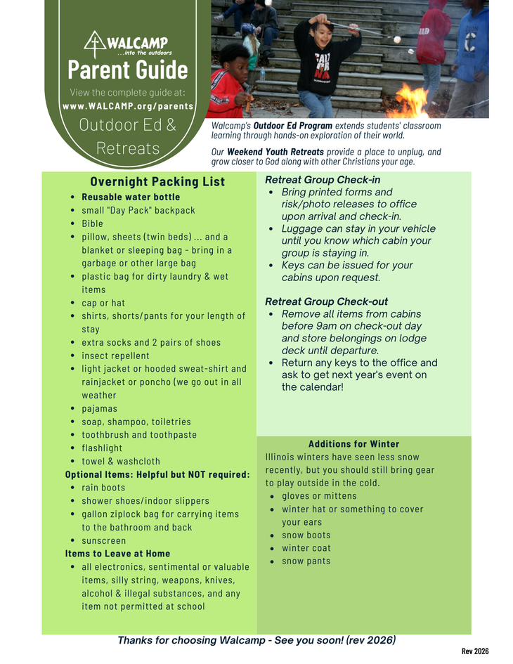 Walcamp is a great day for your class to take a 1-day, 3-day or 5-day immersive environmental education experience. We serve both perocial and public schools.